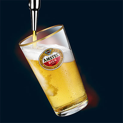 A pretty straight forward blending together of the various parts of the glasses shot by the photographer, ie head, bubbles, spritz, glass edges and branding. Once they were all joined up it was just a case of a nice cutout with some semi transparent glass above the liquid area and the same process for the Amstel.
